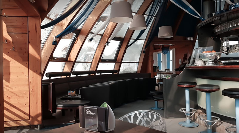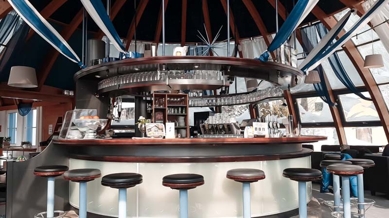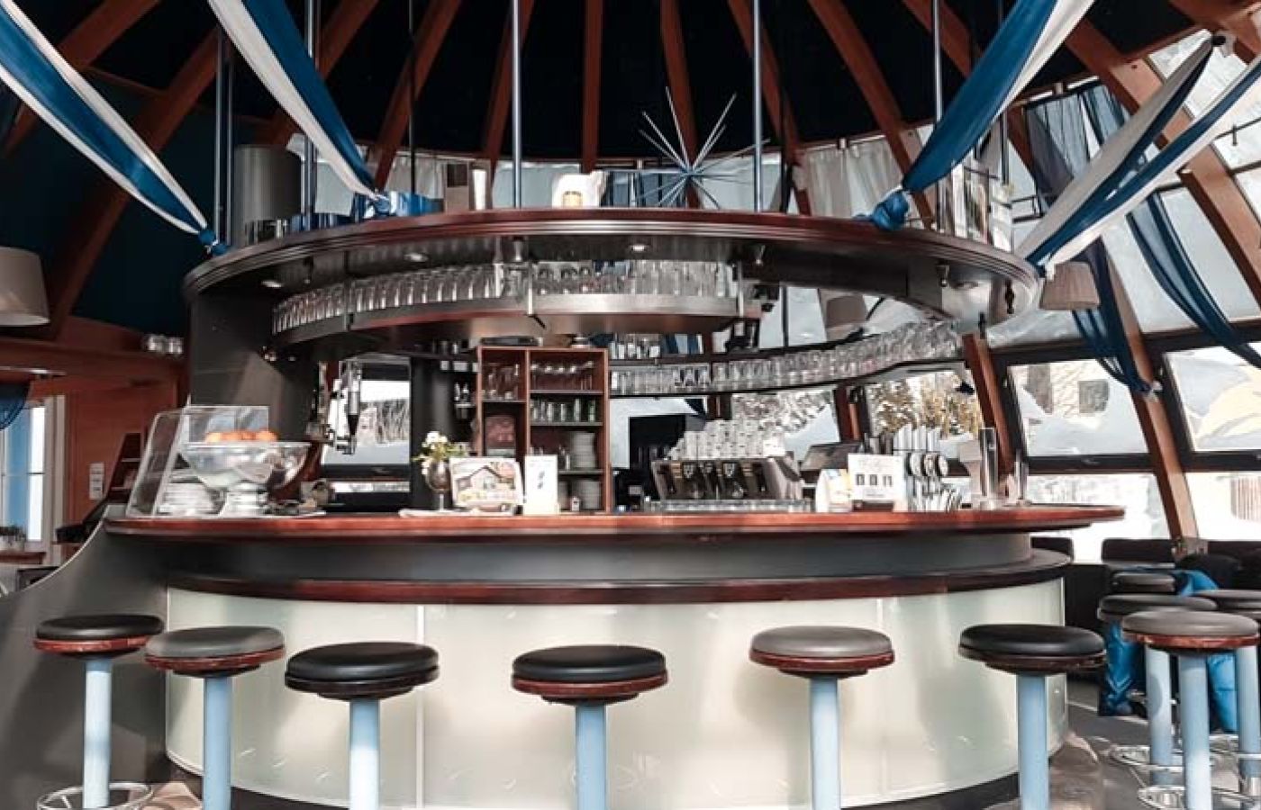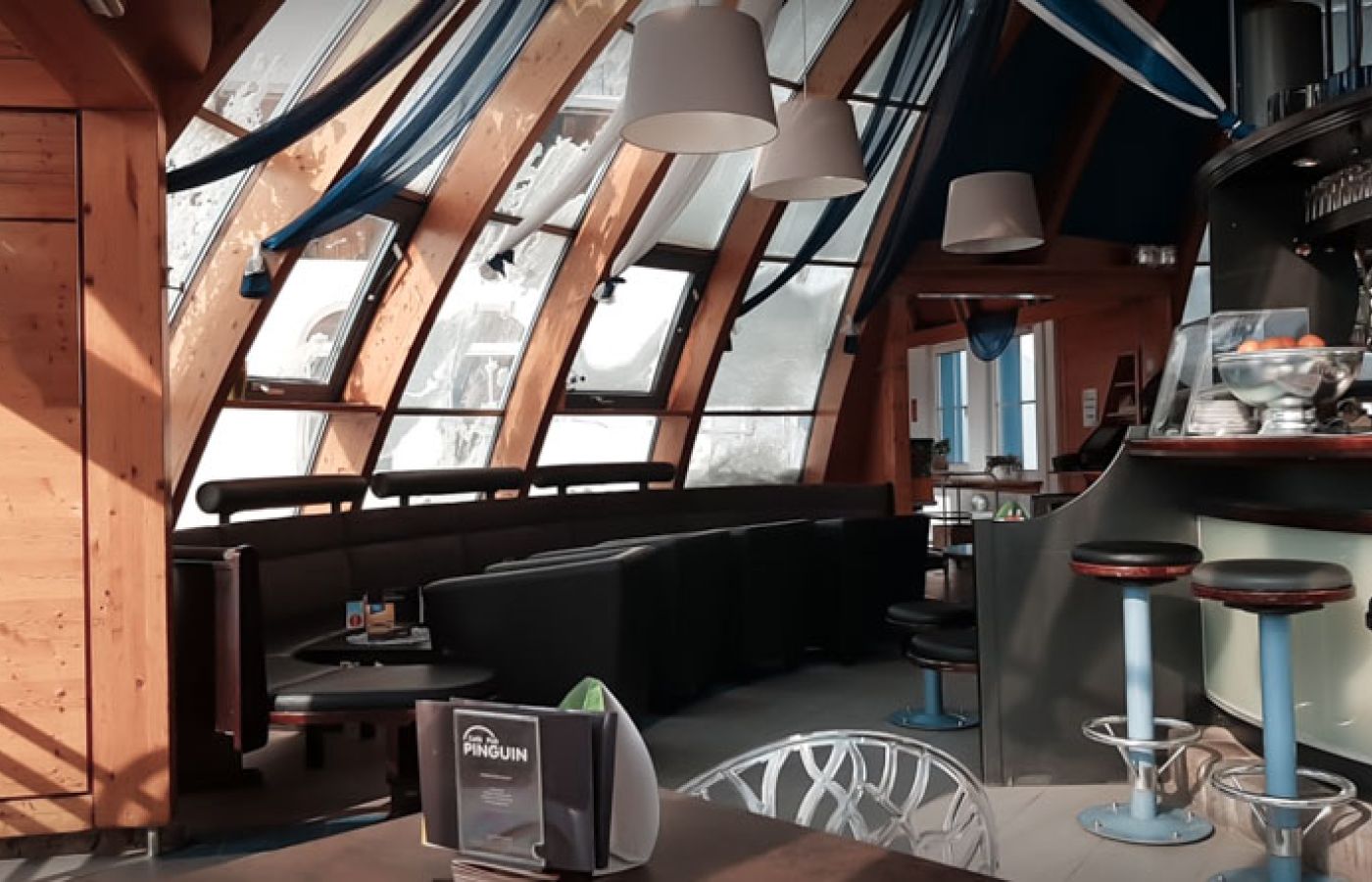 Die auffällige Form und das zeitlose, moderne Design machen es zu einem einzigartigen Lokal.